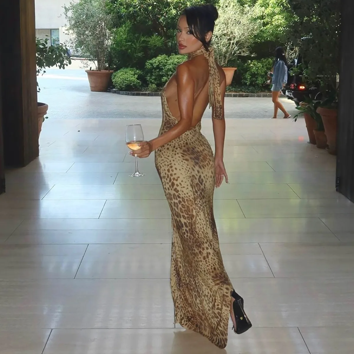 • Cryptographic Fashion Halter Leopard Sexy Backless Maxi Dress Women Club Outfits Bandage Embellished Long Dresses Robe Clothes