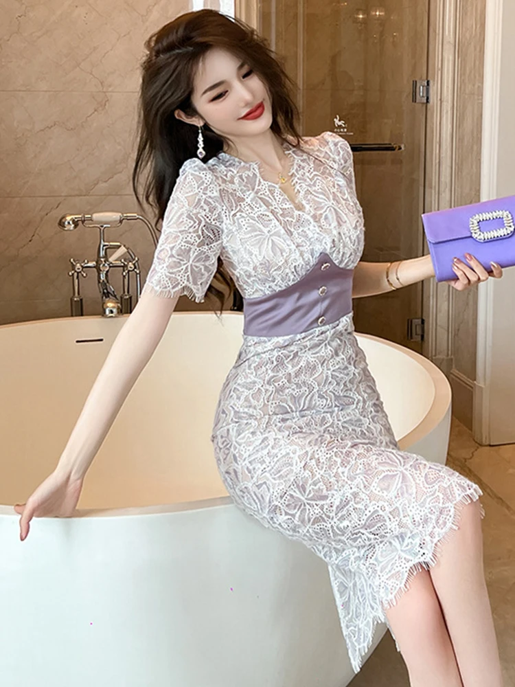 • Elegant Gentle Dress Women Fairycore Sexy Midi Dresses Sheer Lace Hook Flowers Bodycon Split Robe Femme Date Party Date Vestidos