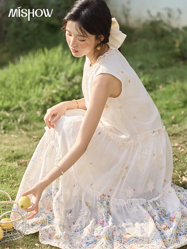 • MISHOW Women��s Fashion Sleeveless Print Dress 2025 Summer New Mushroom Edge O-Neck Lace Up Tassels Loose Midi Dresses MXE36L2253
