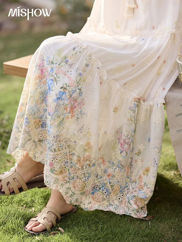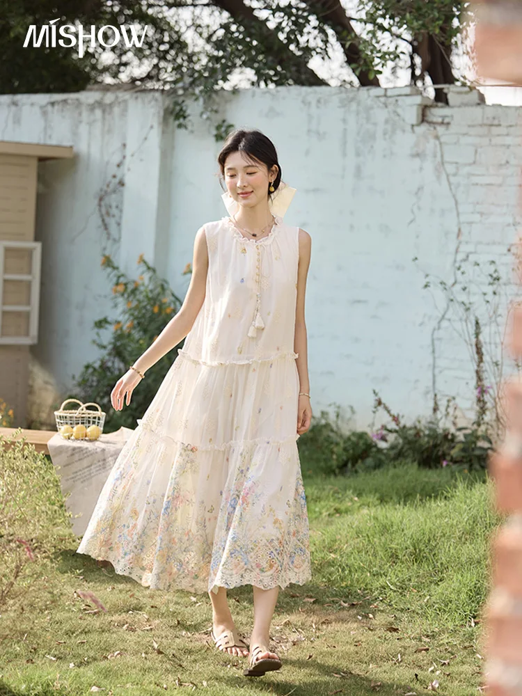 MISHOW Women��s Fashion Sleeveless Print Dress 2025 Summer New Mushroom Edge O-Neck Lace Up Tassels Loose Midi Dresses MXE36L2253