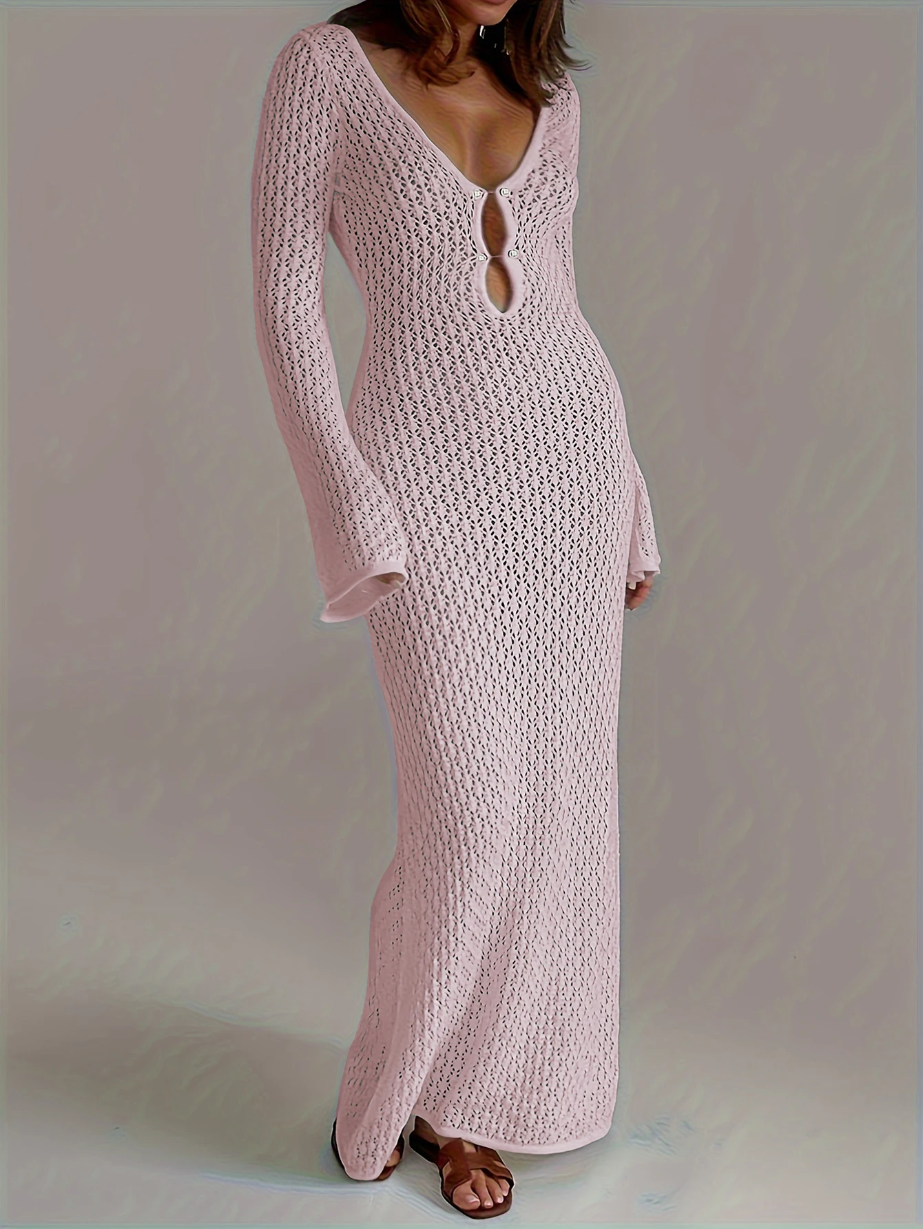 • Sexy Women White Long Knit Sleeve Bikin Fashion Cover up Female See-Through Deep V-Neck Hollow-Out Beach Knitwear Backless Dress
