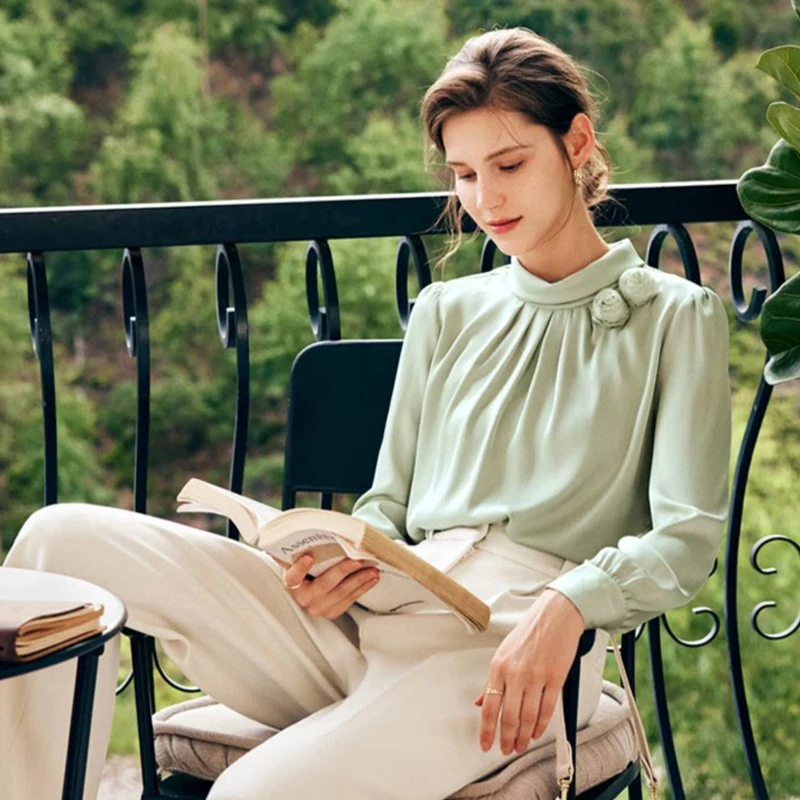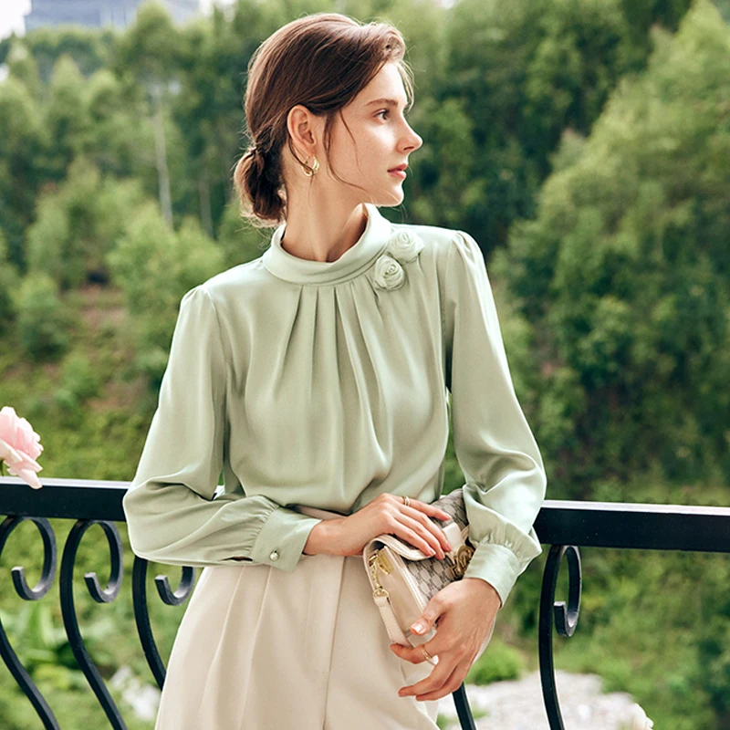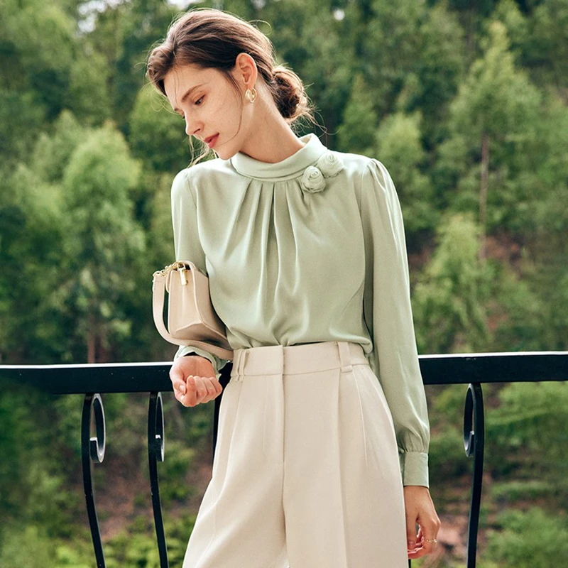 Korean satin small stand-up collar pullover blouse ·Loose H – shaped design ·Fresh and stylish, light green