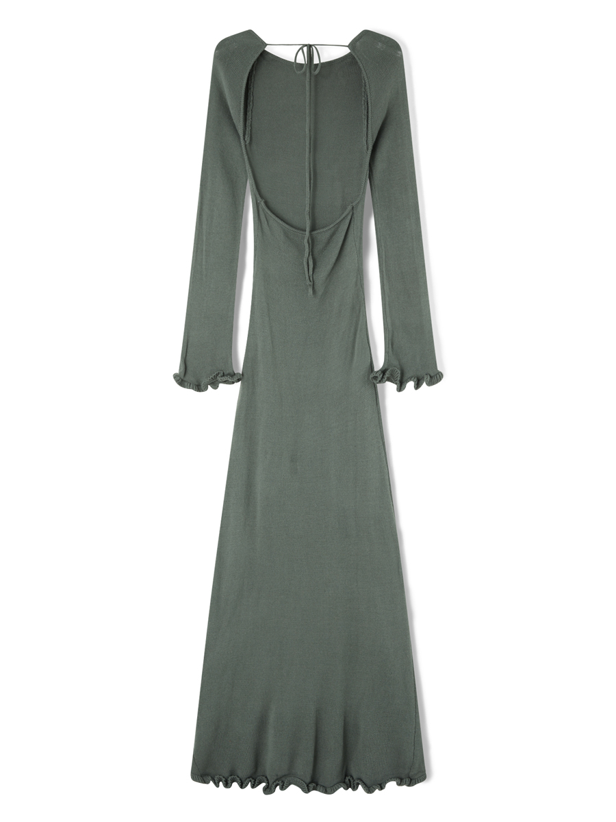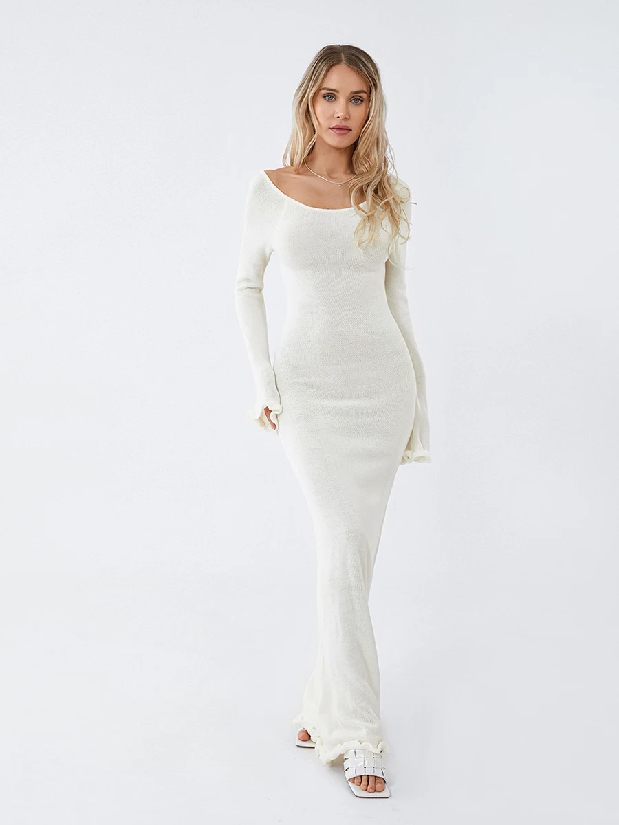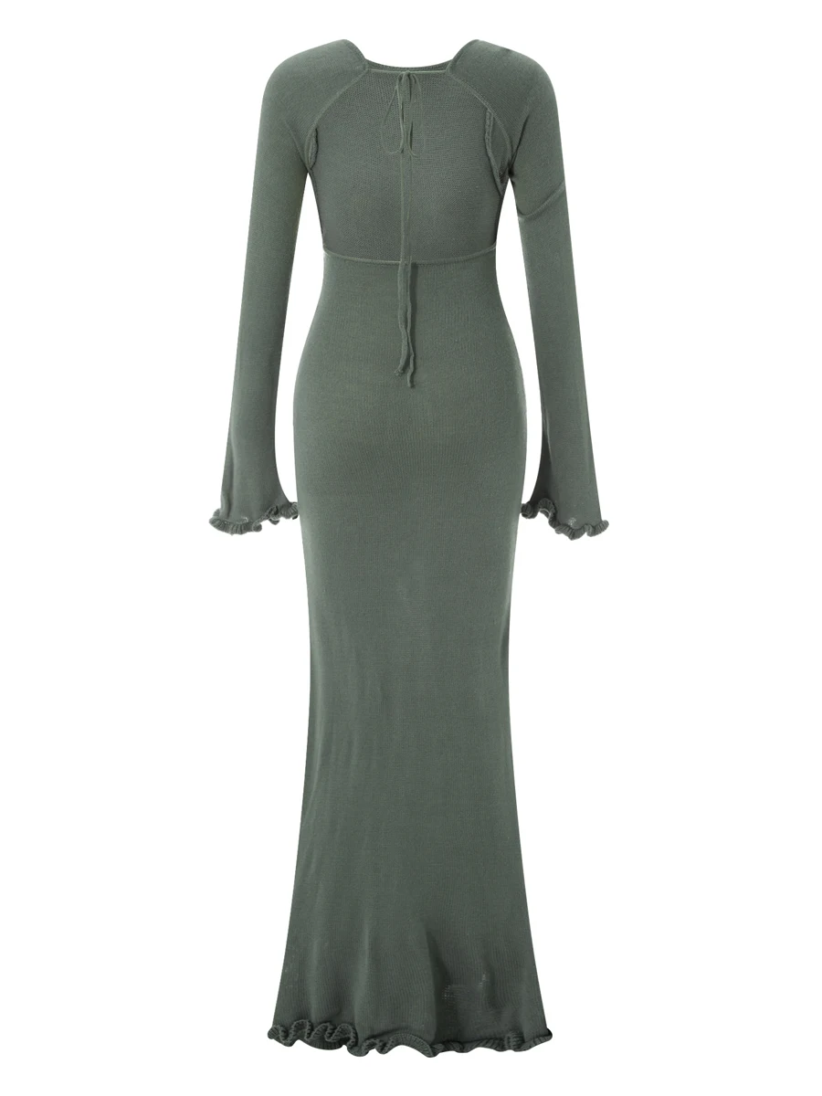 Women��s Knitted Bodycon Dress Long Sleeve Tie Backless Round Neck Solid Color Ruffle Trim Long Dress Beachwear